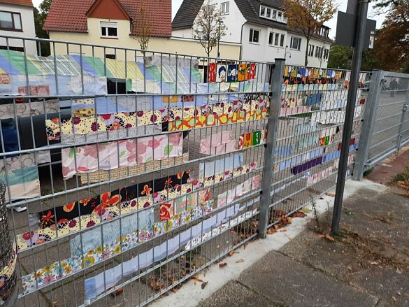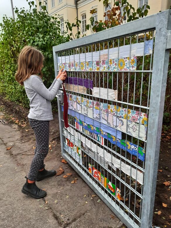 Danach ging es daran den neuen Zaun vor der Schule zu verschönern. Dafür hatte Frau Düerkop verschiedene Stoffreste von Schüler:innen und Lehrer:innen gesammelt und mit Hilfe von Schüler:innen in Streifen geschnitten. Diese Streifen sollten nun durch die Stäbe des Zauns gewebt und befestigt werden.