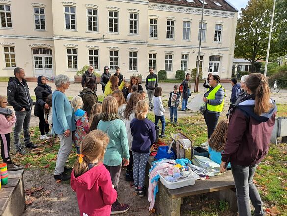 Um 15 Uhr trafen sich alle Beteiligten auf dem Schulhof. Es gab eine kurze Besprechung und danach wurden Zangen, Handschuhe und Eimer zum Müll sammeln verteilt. Diese Hilfsmittel wurden der Schule von „Hemelingen räumt auf- eine Aktion der Bremer Stadtreinigung“ zur Verfügung gestellt. Unsere Gesundheitsfachkraft Frau Schütz hatte dieses organisiert.