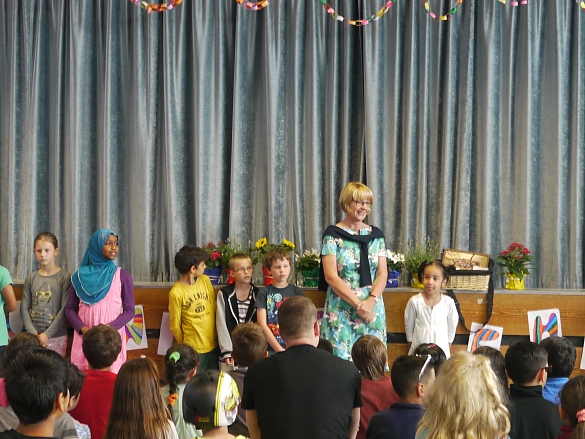 Alle Schüler, Lehrer, Angestellten der Schule und geladene Gäste hatten sich in der festlich geschmückten Halle eingefunden, um Frau Willers für ihr Engagement zu danken und sie zu feiern. Von allen Seiten strahlte Frau Willers ihre Gäste an, denn die Schüler hatten viele Portraits von Frau Willers gemalt, die nun die Wände der Halle schmückten. Nachdem unsere Konrektorin Frau Rugen für alle noch einmal darstellte, was Frau Willers für die Schule an der Glockenstraße alles geleistet hat, gaben die Lehrer und Angestellten der Schule einen musikalischen Ausblick auf die bevorstehende Pension. Es wurde vermutet, dass die flotte Frau Willers mit ihrem e-bike in die Schweiz saust, um Probleme zu stemmen, wenn sie nicht gerade ihre kleine Enkelin oder ein Konzert in der Music Hall genießt.