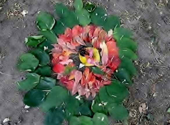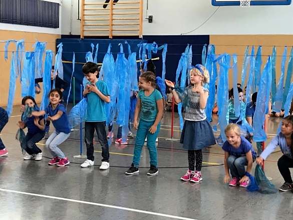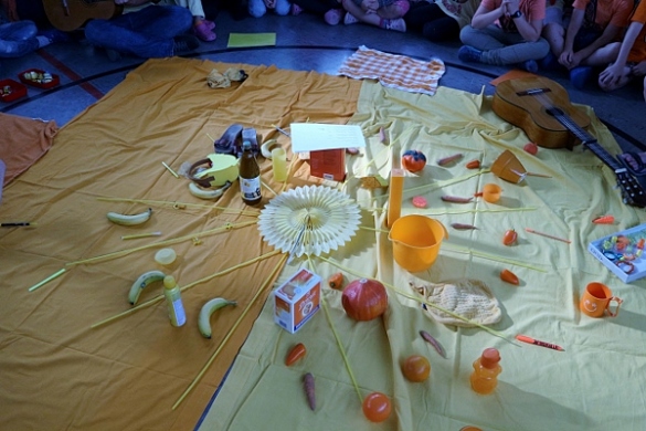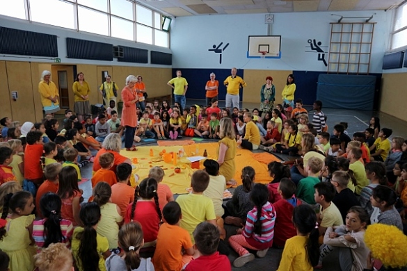 Der Montag stand unter dem farblichen Motto Gelb und Orange. Um 8:00 Uhr traf sich schließlich die gesamte Schule zum ersten Farbkreis in der Turnhalle, die getreu den Tagesfarben geschmückt war. Gemeinsam wurden die von den Kindern im Vorfeld gesammelten Hosentaschenschätze präsentiert und das „Lied der Farben“ gesungen. Dieses sollte sich bis zum Donnerstag unter täglich wechselndem Farbenmotto wiederholen.