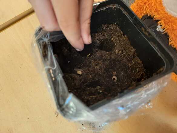 Und später haben sie Sonnenblumensamen in Töpfe eingesät. Wir hoffen, dass sie dann bei der Einschulung für unsere neuen Erstklässler*innen blühen werden.