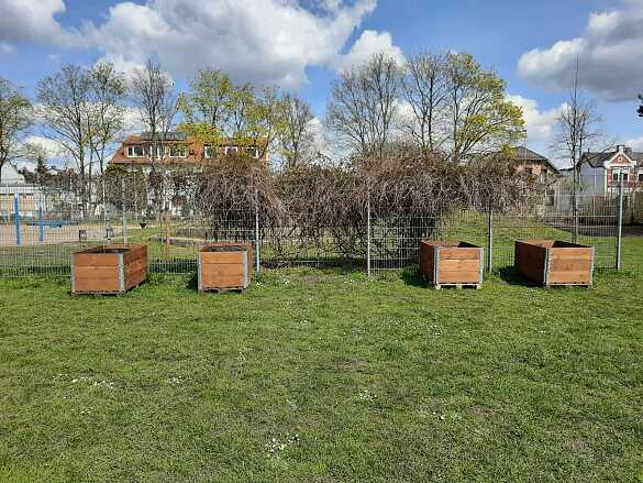 Vier Hochbeete wurden uns vom ASB gespendet. Sie stehen bereits zwischen Bolzplatz und Spielplatz. Von tatkräftigen Gärtner*innen des ASB frisch lasiert und fachgerecht befüllt, konnten die vorgezogenen Pflanzen der Kinder in die vier neuen, großen Holzkisten umgepflanzt werden. Vielen Dank an das ASB-Team!