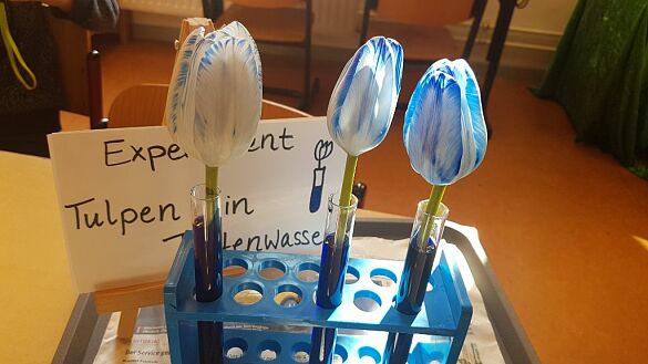 Zudem wurde in der 1b ein hoch spannendes Experiment durchgeführt. Hier stellten die Kinder eine Tulpe in Tintenwasser, um den Wassertransport zu veranschaulichen.